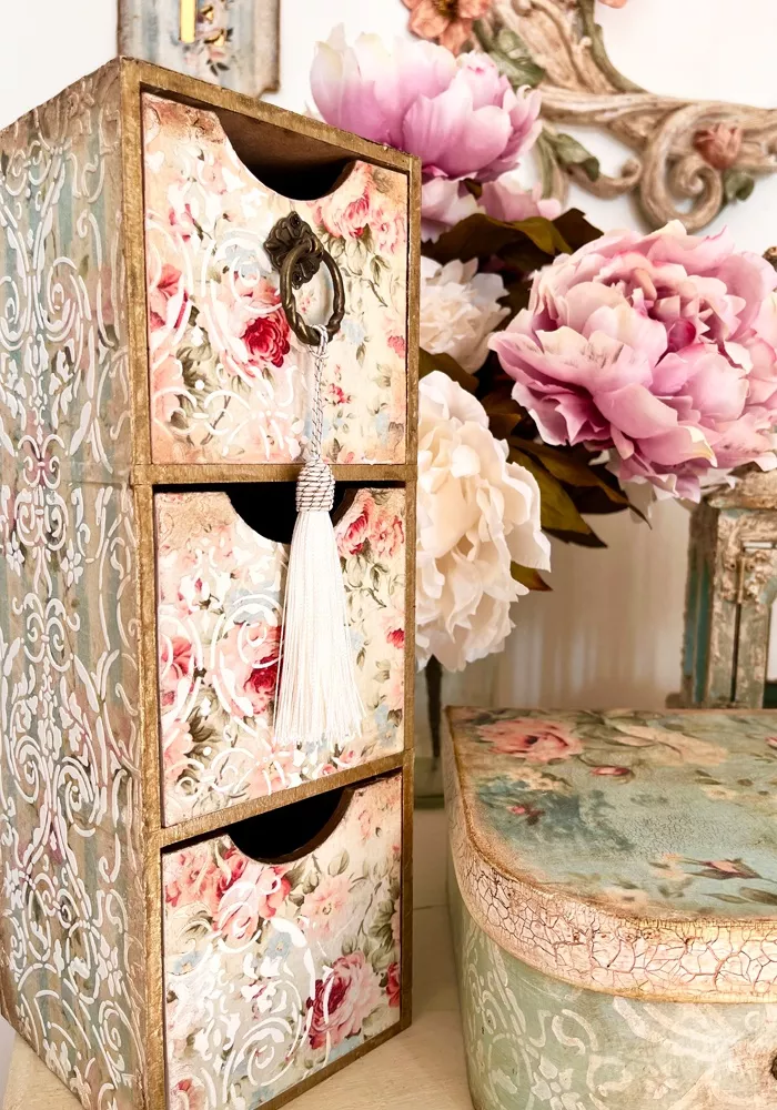 - Caja floral con decoupage, stencil en relieve y veladuras