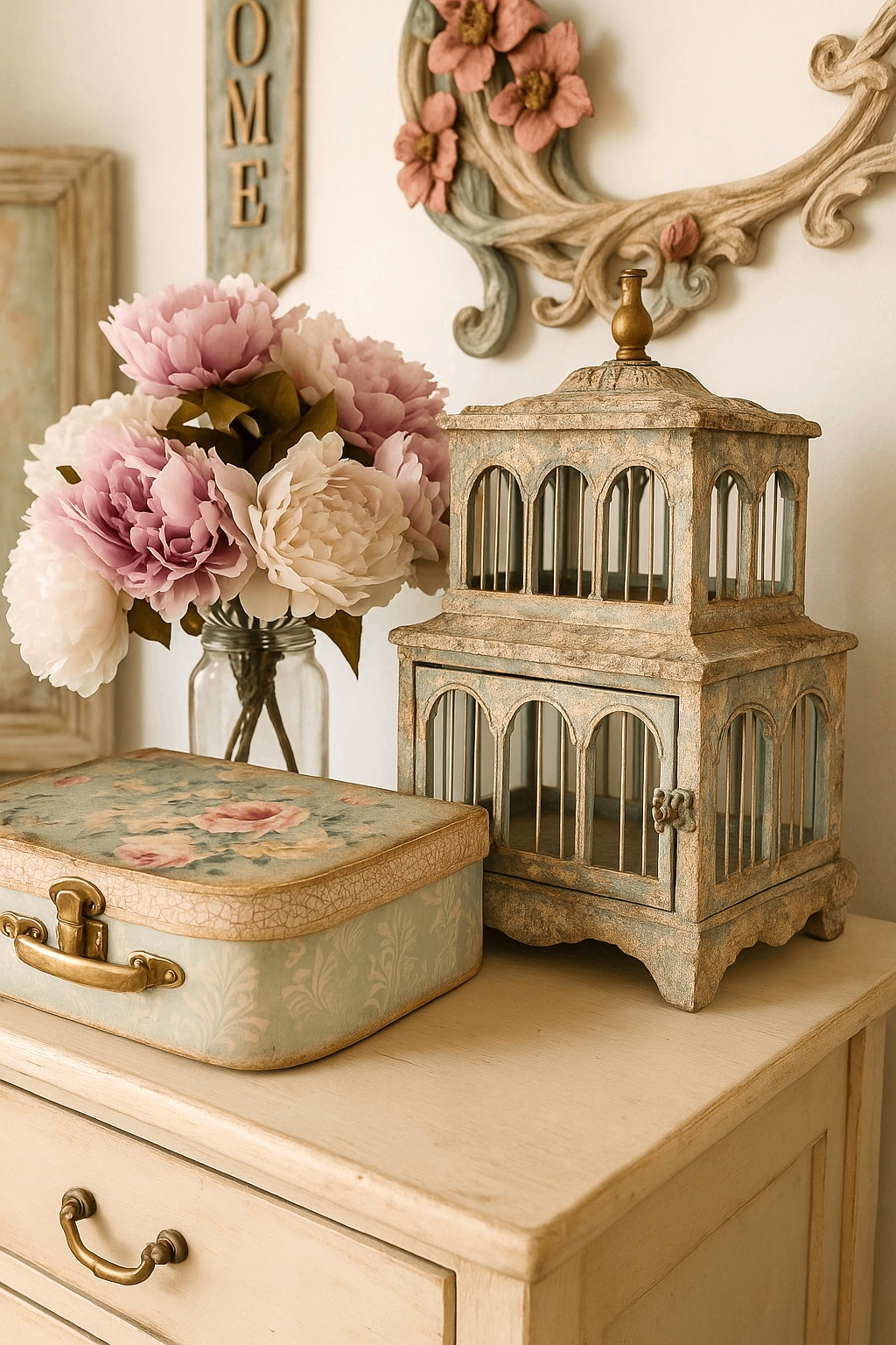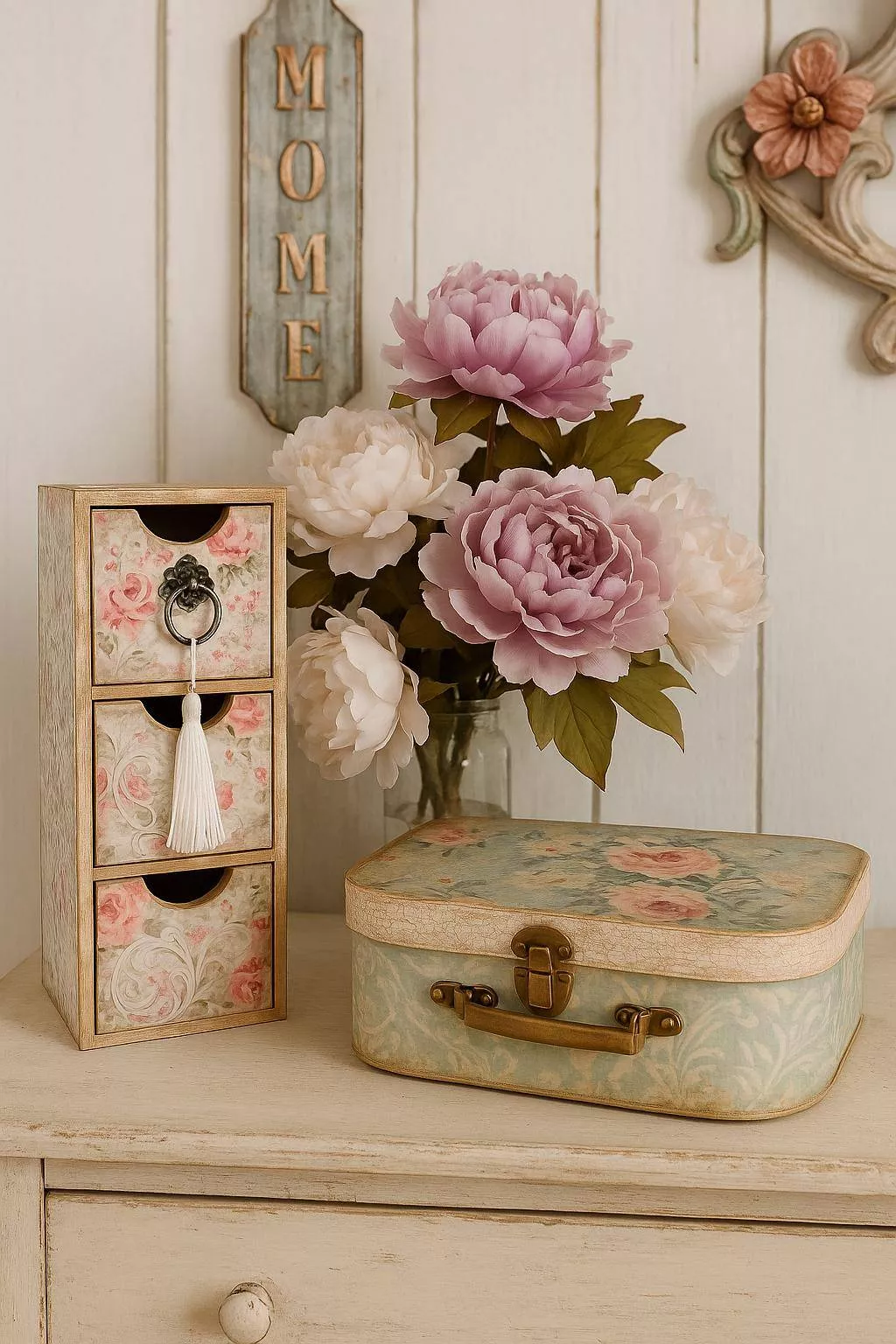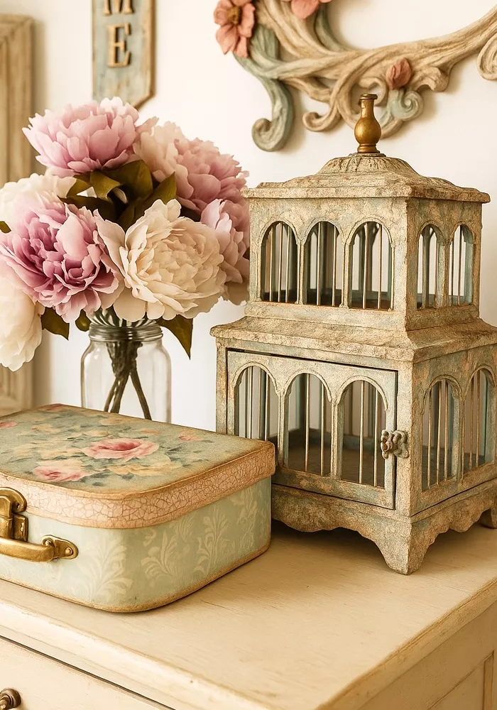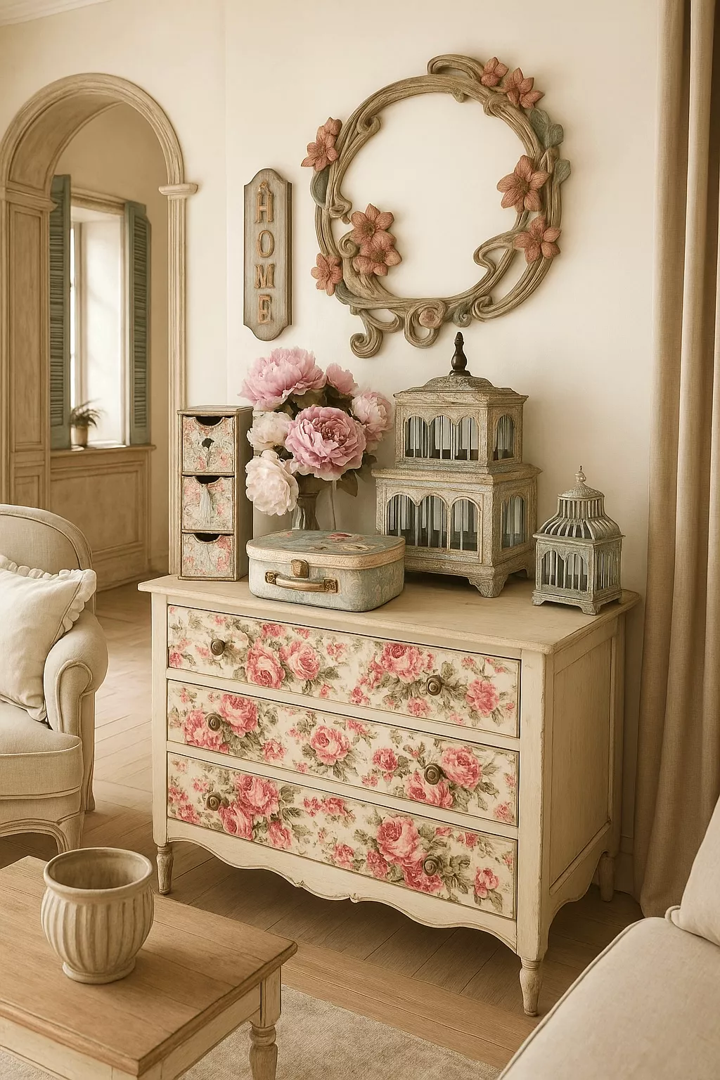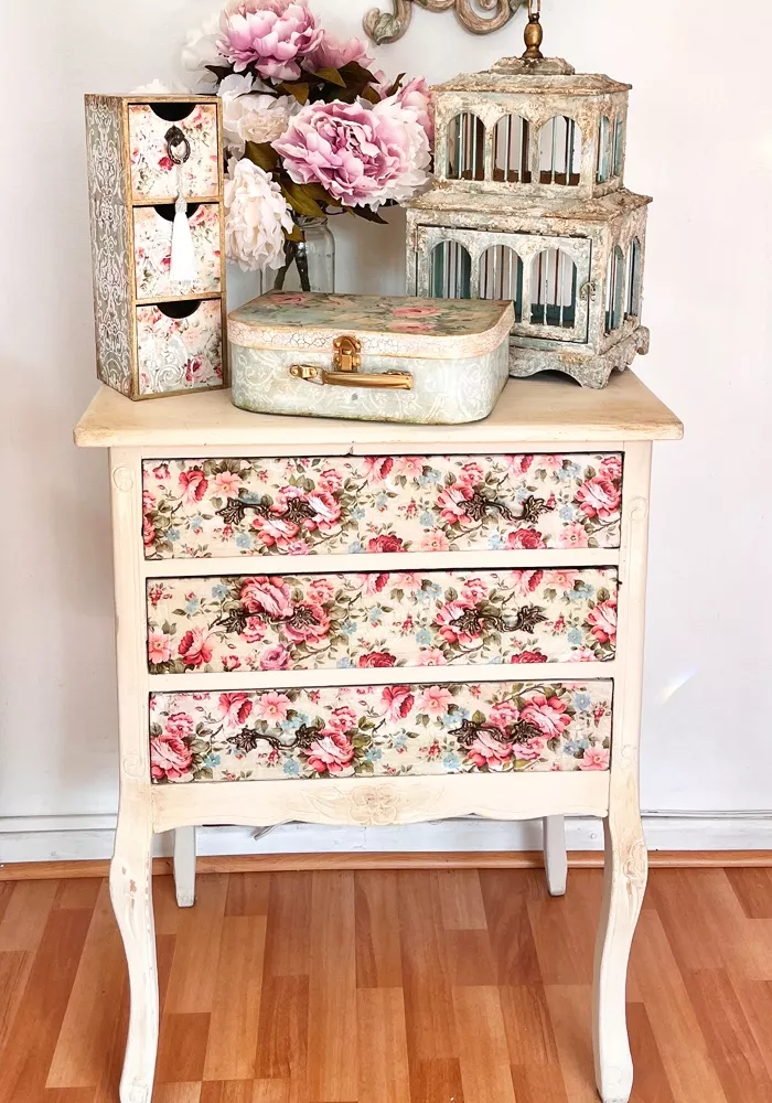 - Cómoda con decoupage, decapado y cera para acabados románticos.