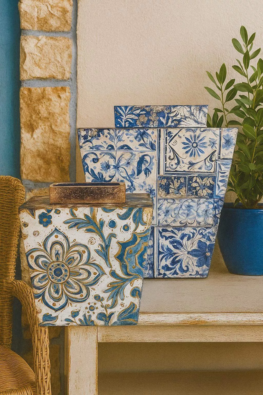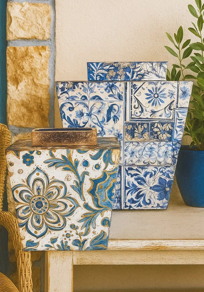 - Jarrón mosaico: decoupage imitación de azulejos pintados a mano.