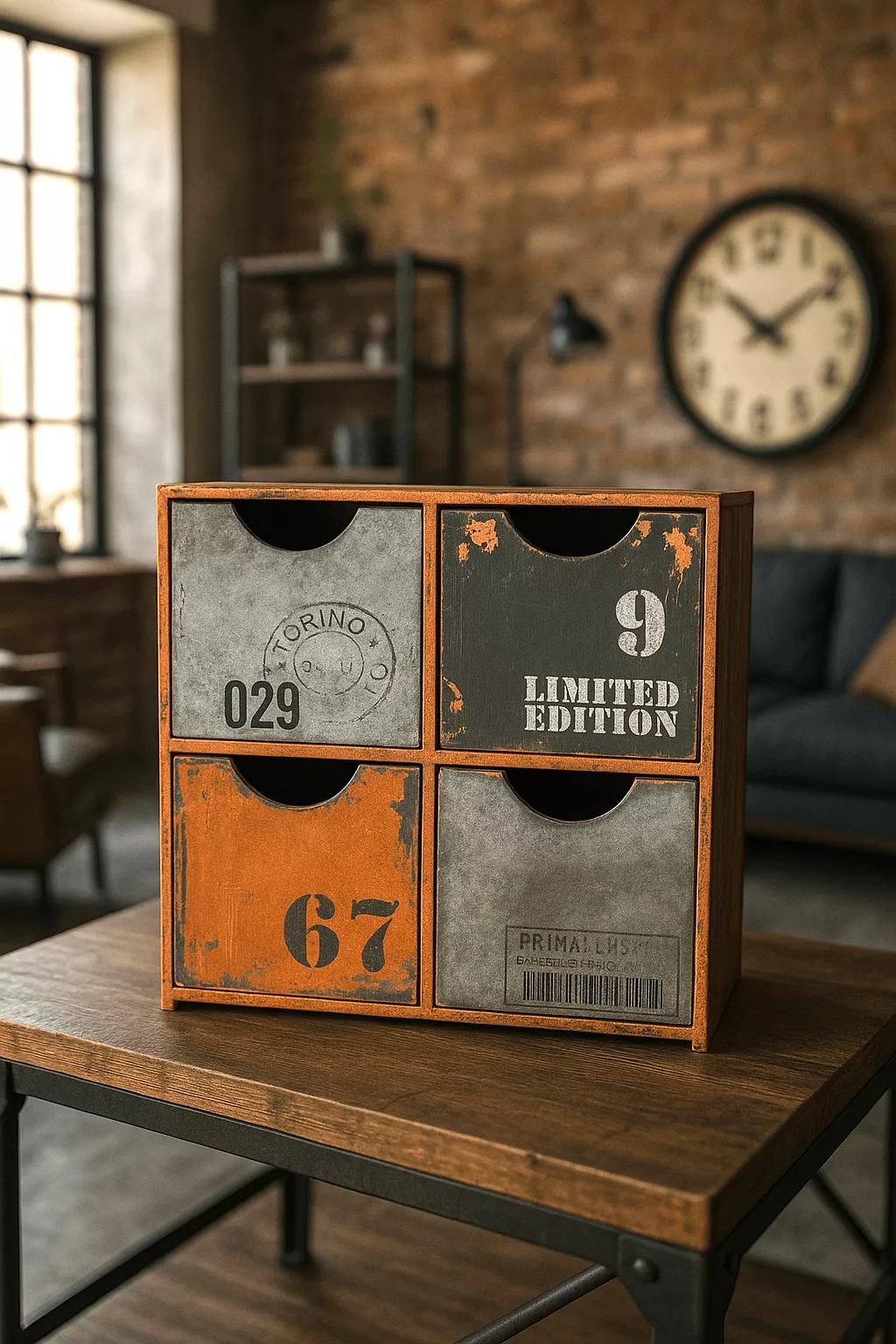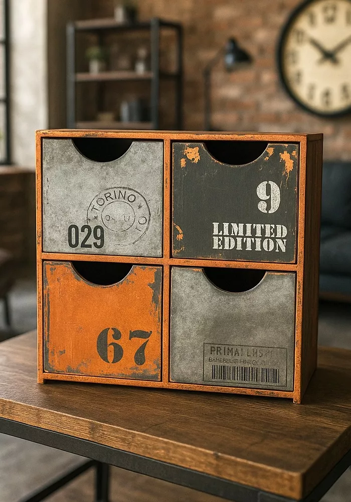 - Caja con efecto veteado de madera y metal.