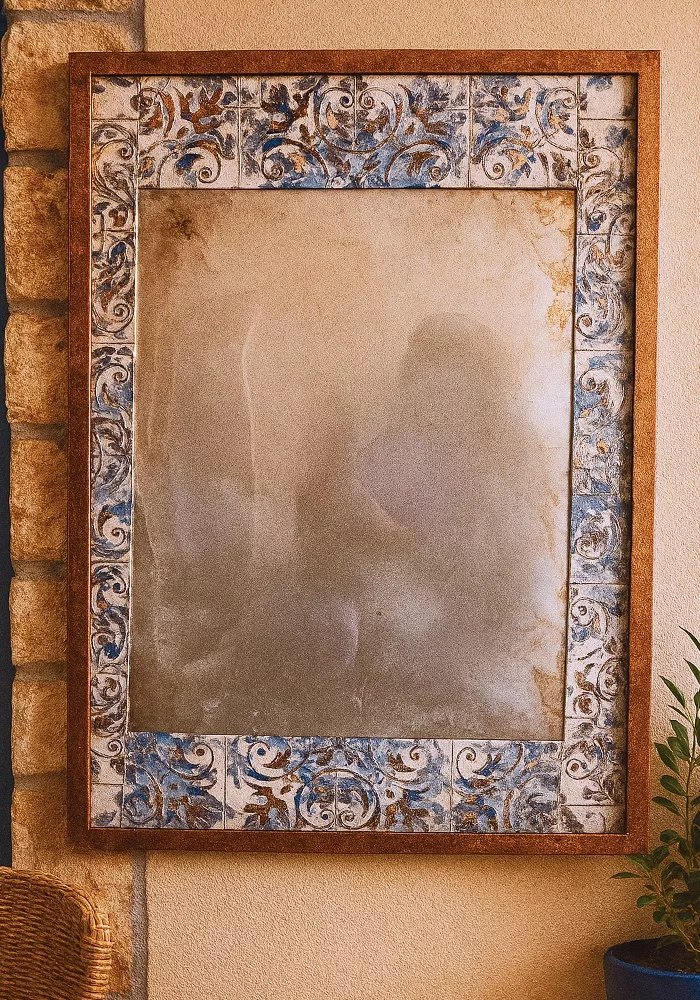- Marco espejo de resina con relieve, pátina envejecido y craquelado.